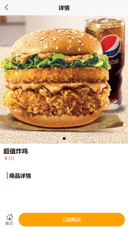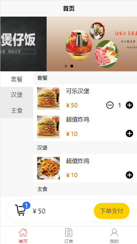 首页显示搜索菜品,轮播图,菜品分类,根据分类展示菜品(可带推荐算法)点击菜品进入菜品详情,可以点击购买下单,也可以加入购物车及收藏菜品