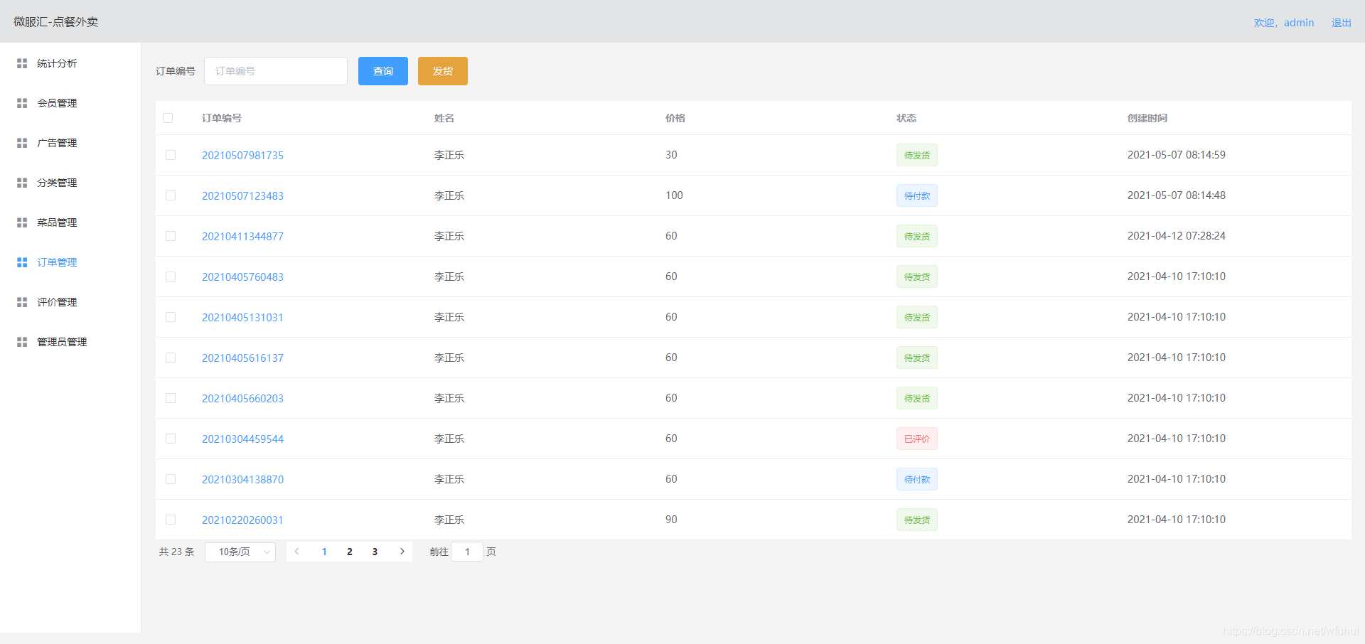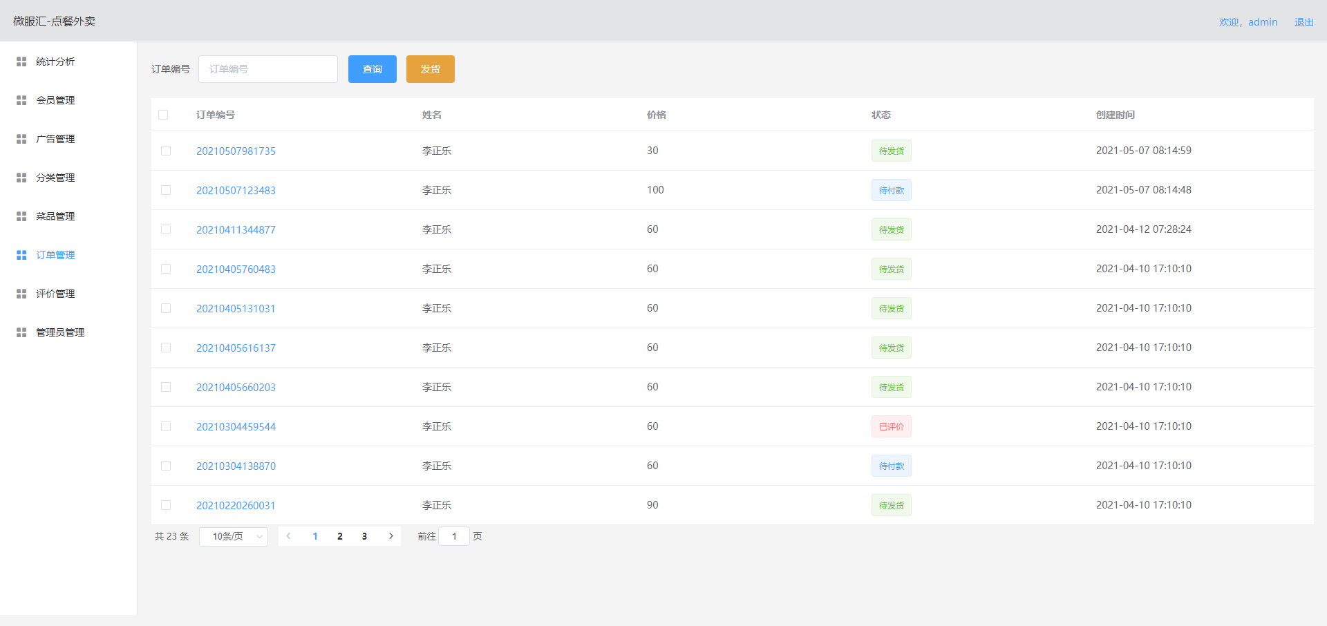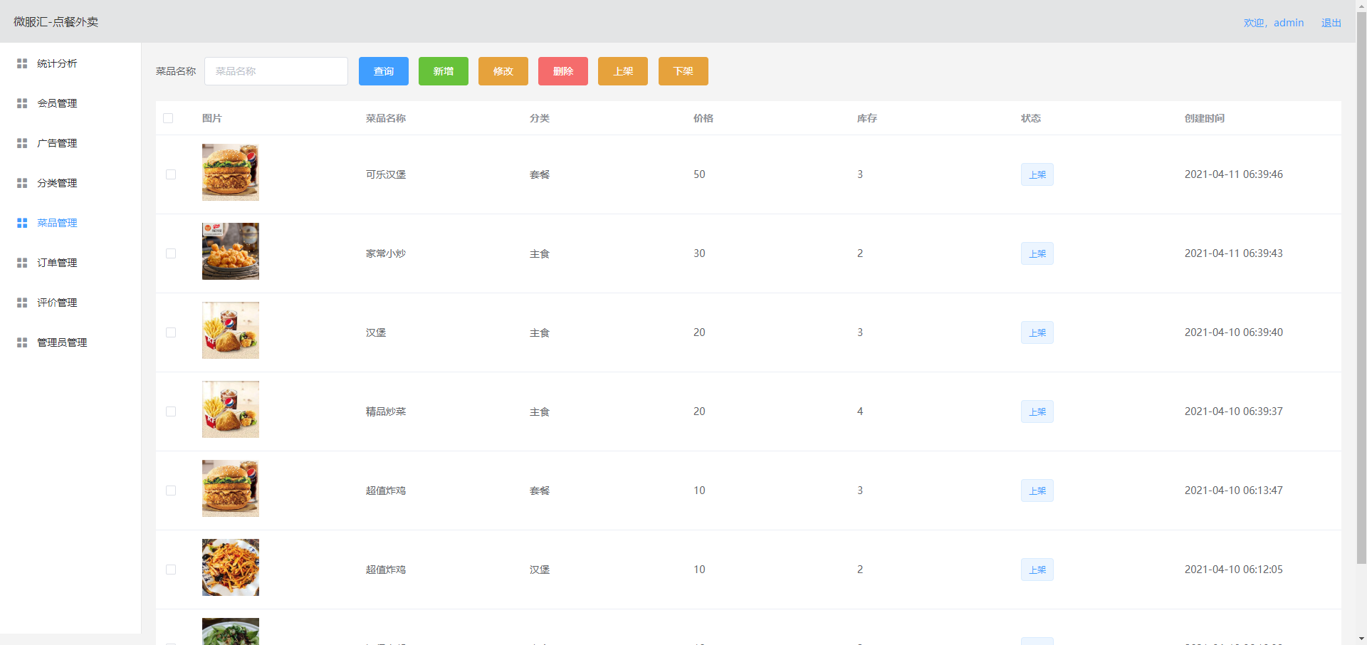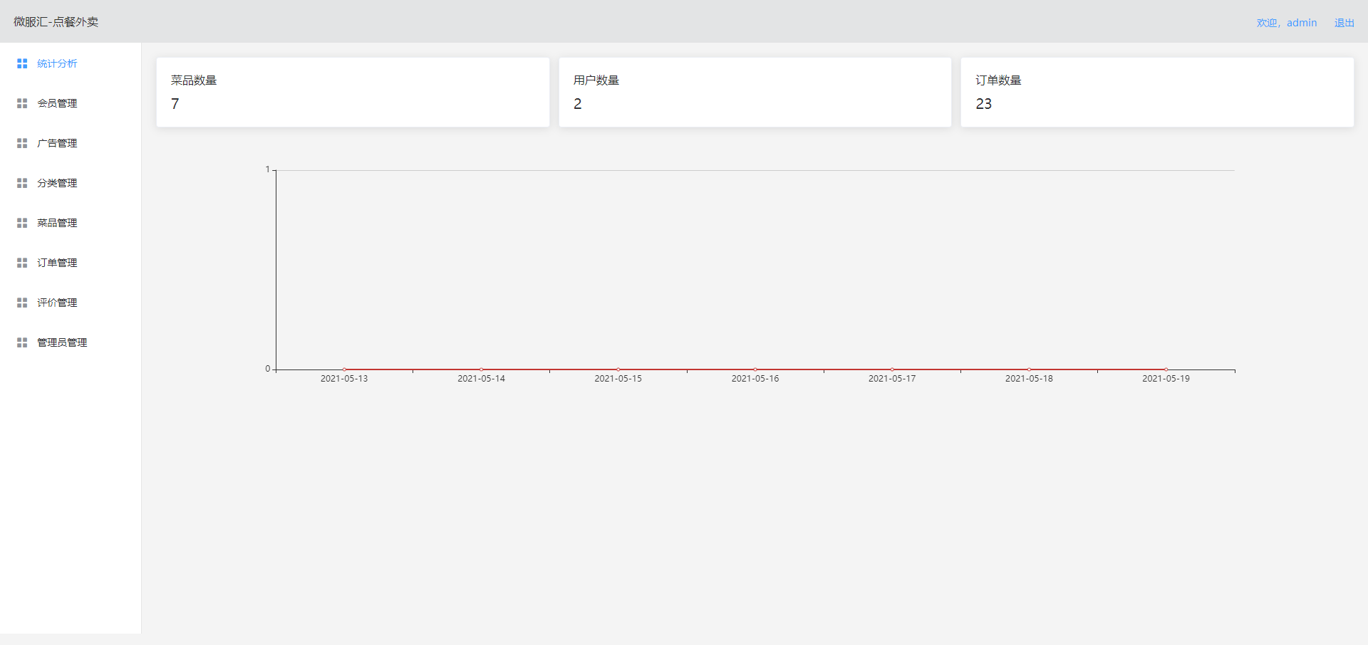统计分析:查看用户,菜品,订单数量;统计近7日订单趋势
