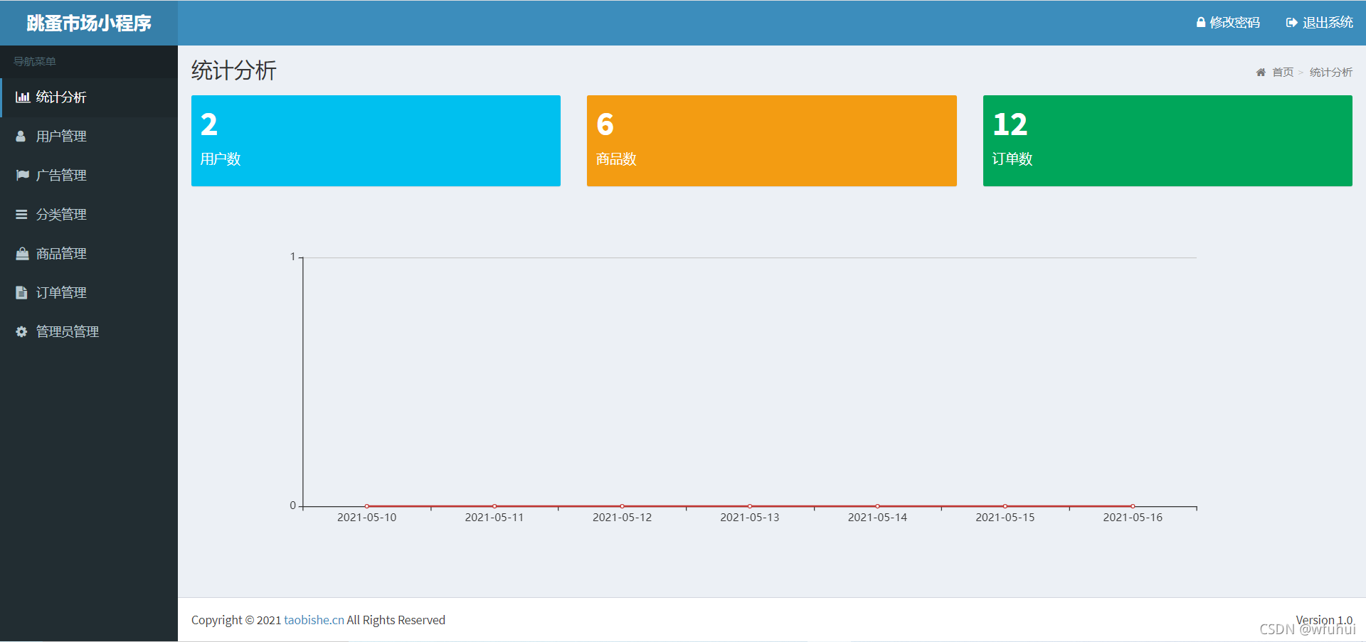 统计分析:查看用户,商品,订单数量;统计近7日订单趋势