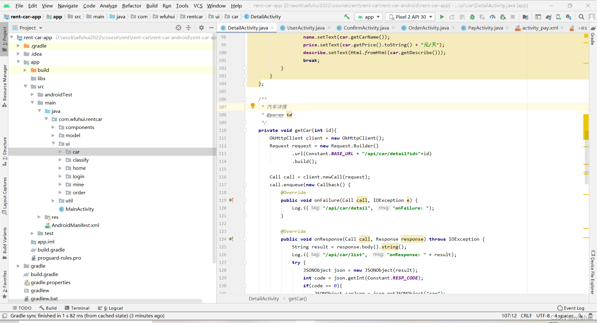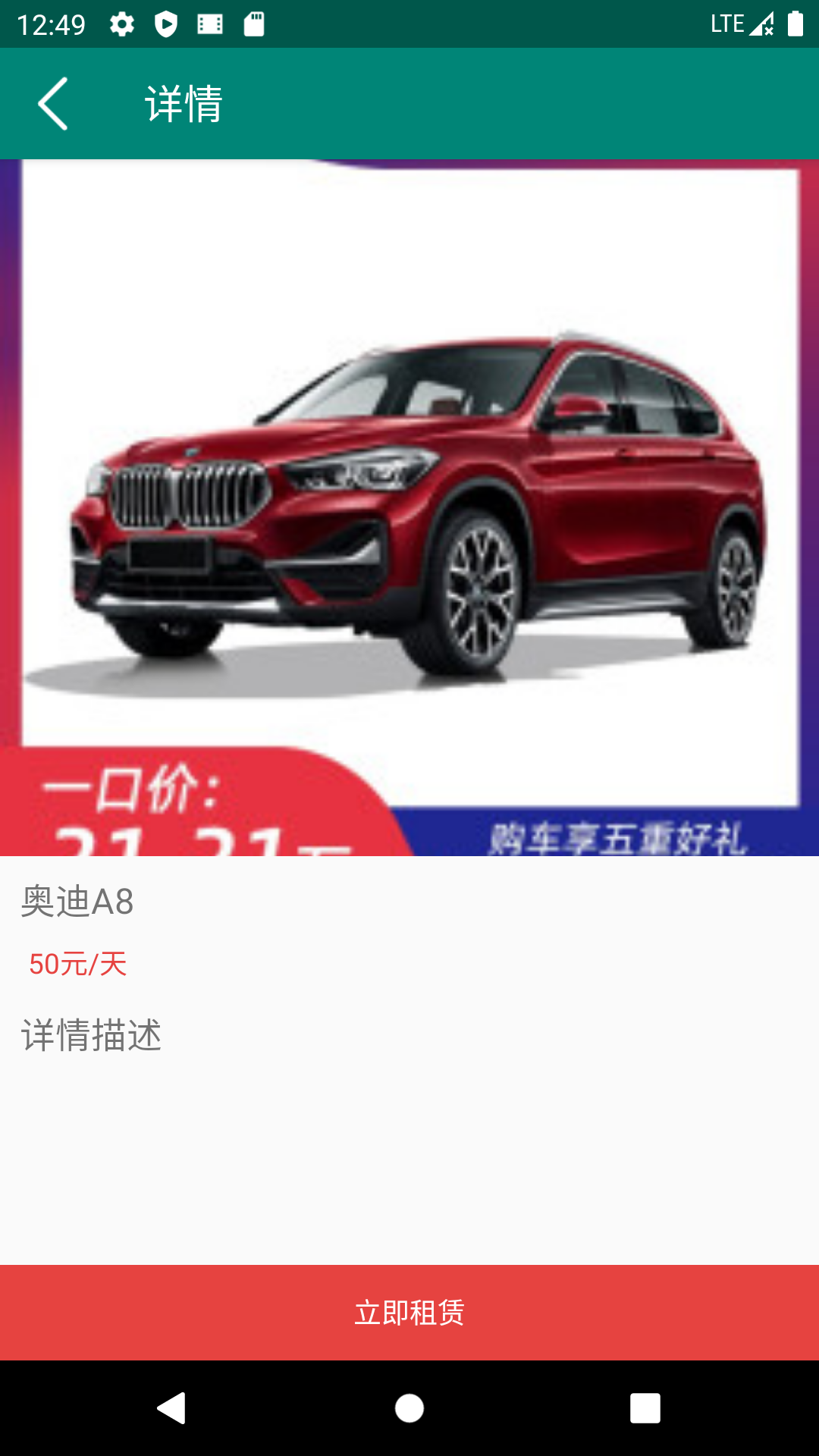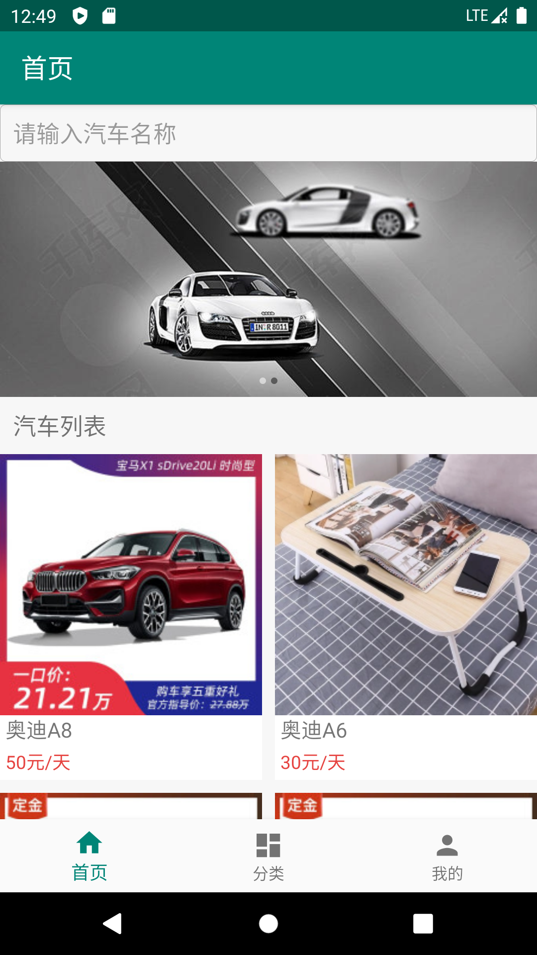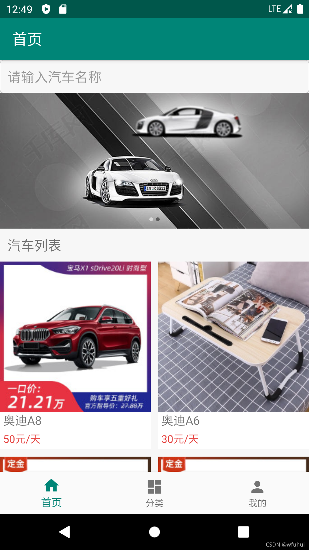 首页显示搜索汽车,轮播图,汽车列表,可以点击到详情进行租赁