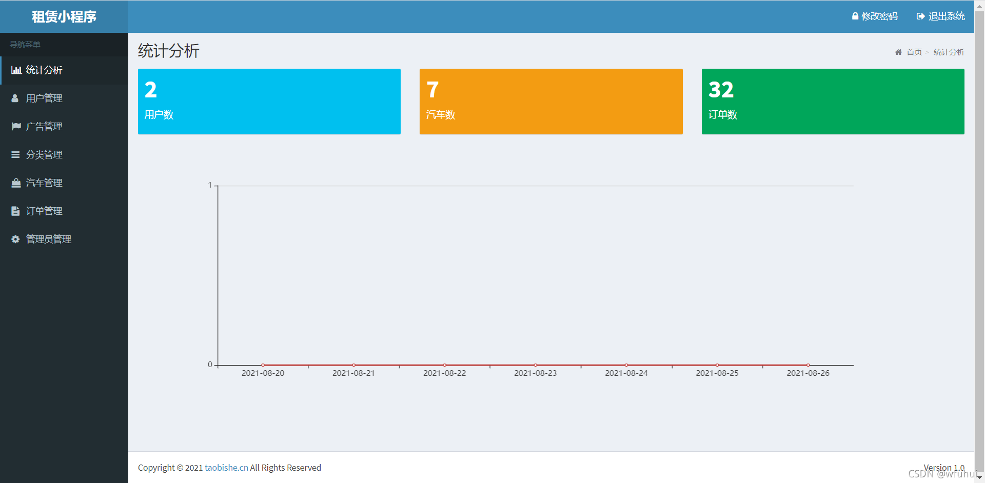 统计分析:查看用户,汽车,订单数量;统计近7日订单趋势