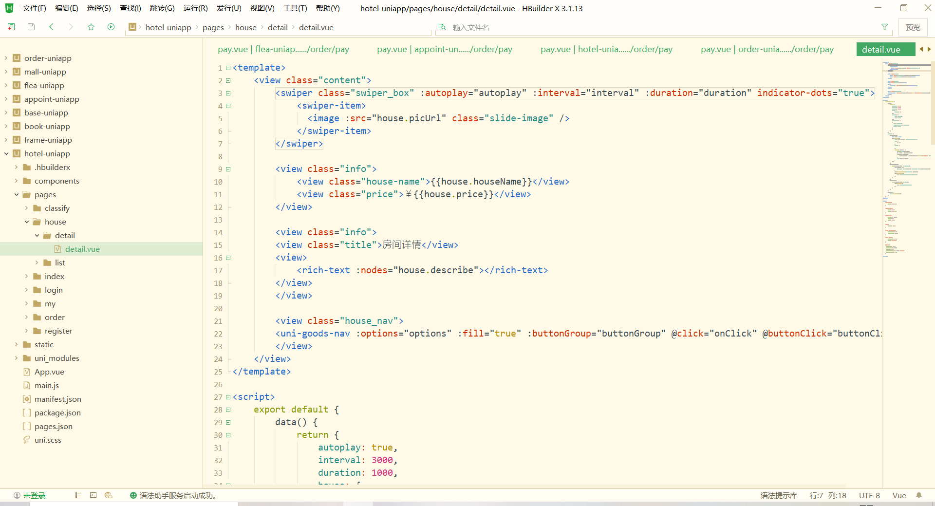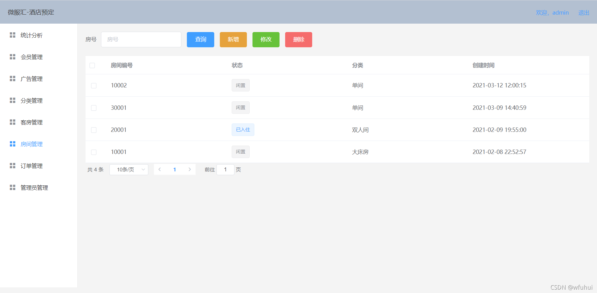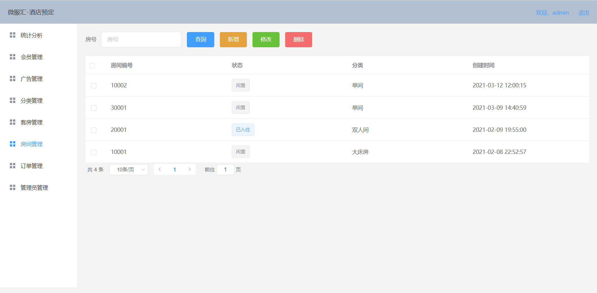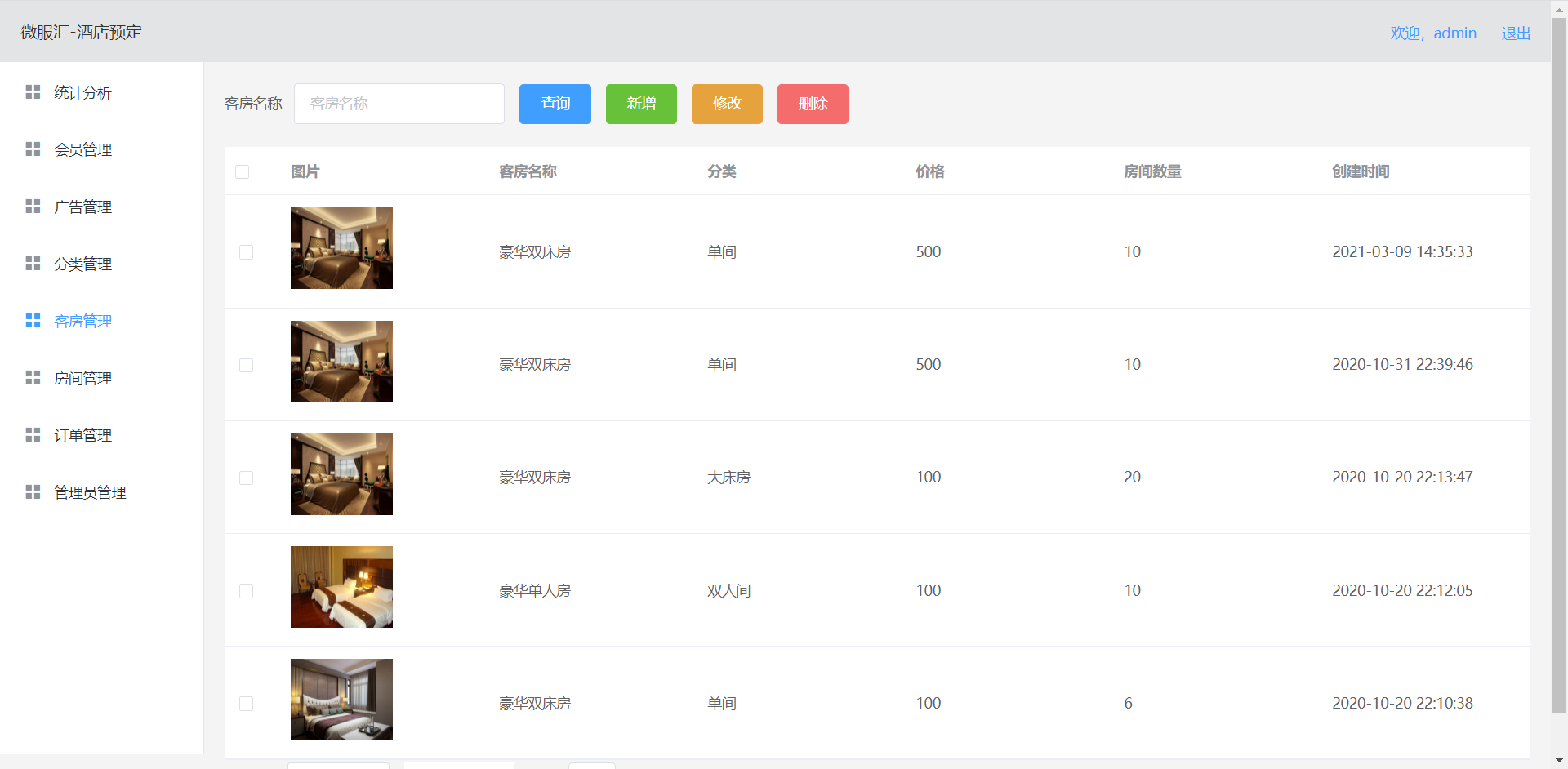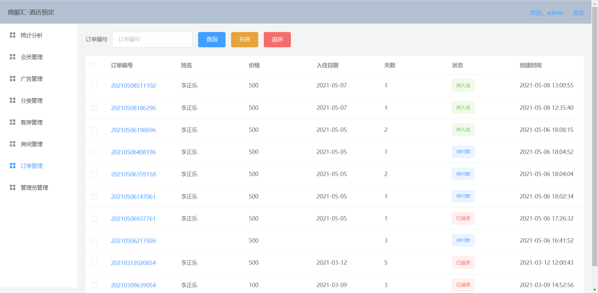 统计分析:查看用户,客房,订单数量;统计近7日订单趋势